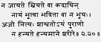 (He is not born nor does He ever die; After having been, He again ceases not to be. Unborn, eternal, changeless and ancient, He is not destroyed when the body is destroyed)